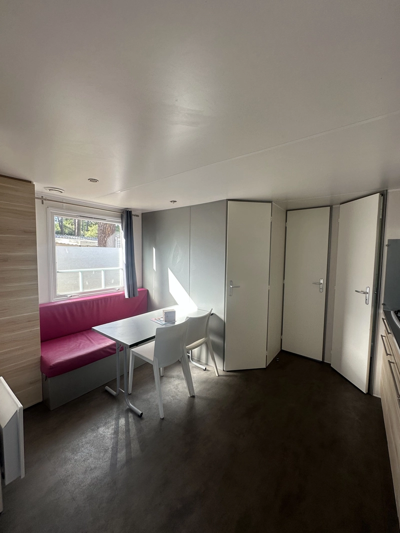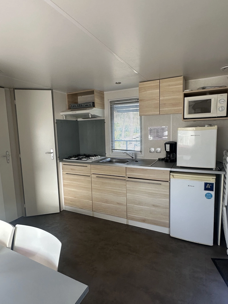 The Type B mobile home, ideal for 2 to 4 people, is the most common rental option at the campsite. Choose from shaded or unshaded pitches. Enjoy a moment of relaxation on the covered terrace. The master bedroom is separate from the children's bedroom.